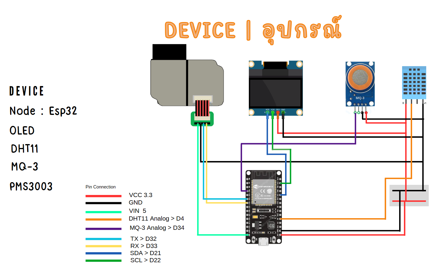 สร้างอุปกรณ์วัดค่าฝุ่น PM2.5 แบบพกพา โดยใช้เซ็นเซอร์วัดฝุ่น PMS3003 ร่วมกับไมโครคอนโทรลเลอร์ ESP32 และจอ OLED สำหรับแสดงผลค่า PM2.5 พร้อมทั้งออกแบบให้มีแบตเตอรี่ในตัวเพื่อความสะดวกในการพกพา